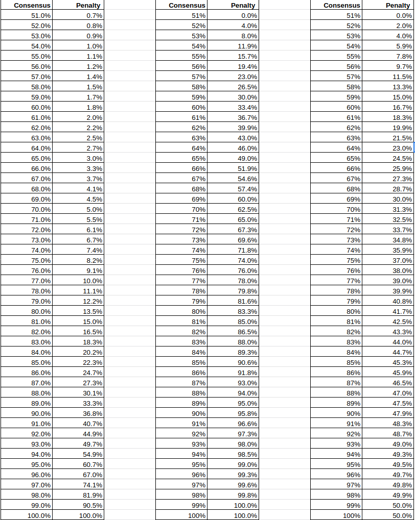 Governance participants will redeem their share of the treasury at each proposal, but instead of withdrawing their entire NAV value, a penalty is retained in the treasury proportionally to the consensus around the proposal, defined as