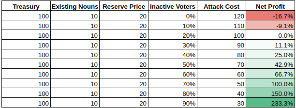 Once the auction ends, if the price is not equal to or greater than the reserve price, the auction is considered nullified, and the underlying Noun is burned. The reserve price would make the EV equal to 0 at most. However, i) it comes at the cost of not allowing a true price discovery on the auctioning cycle ii) it increases the barrier to entry to acquire a Noun iii) it relies on oracles to compute the total treasury value. Furthermore, zero-to-negative EV is assured only in a low inactive voters turnout, as shown in this example table.