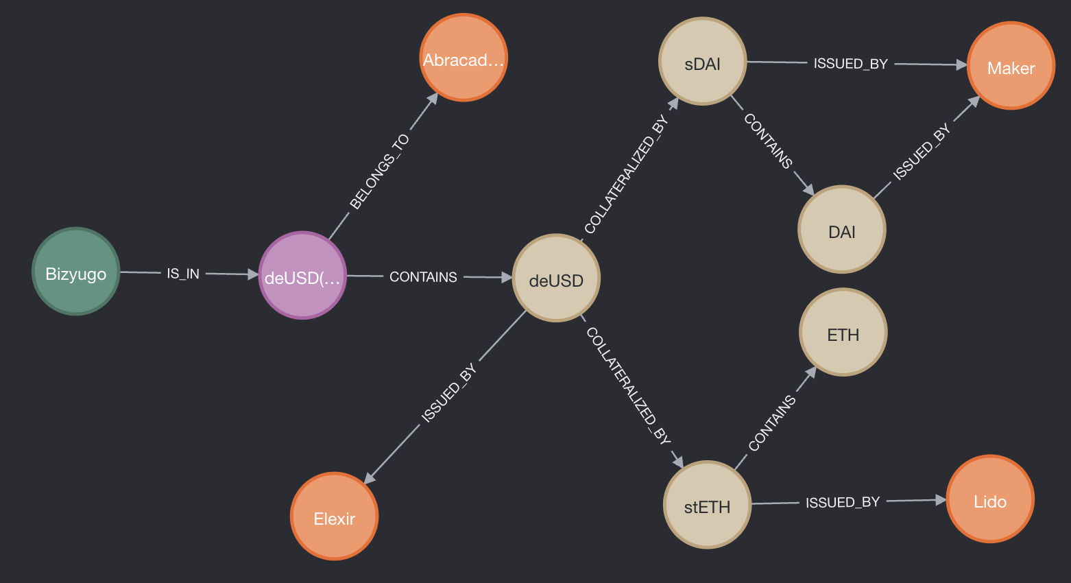 In the following example, we break down an allocation of deUSD to an Abracadabra pool, which introduces additional dependencies on Maker and Lido through deUSD's collateralization mechanism. If Maker fails, deUSD will be affected as well.