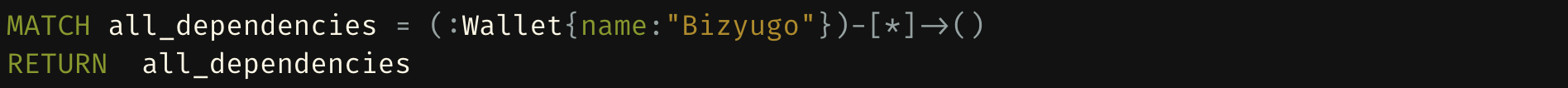 The query identifies the newly introduced wallet node ("Bizyugo") and initiates a Breadth-First Search (BFS), traversing all possible directed edges originating from the wallet. This process maps the entire network of dependencies, providing a comprehensive view of how the wallet is interconnected with other entities within the graph.