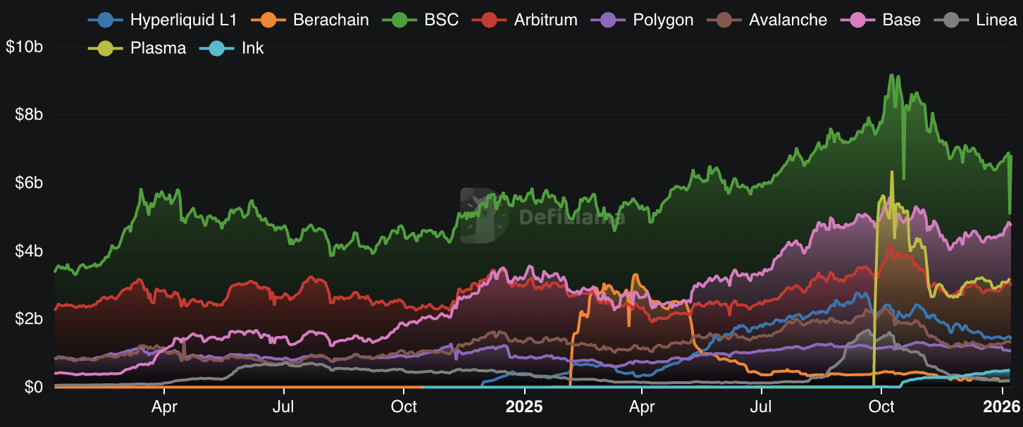 As Operators ourselves, we avoid betting on which chain will dominate and prefer deployment flexibility. Chain TVL fluctuates drastically over time, with new incumbents coming to market regularly (figure 4). Native cross-chain execution provides diversification benefits and ensures Makina is positioned for any eventuality in protocol and chain dominance over time, always positioned to where the best incentives are.