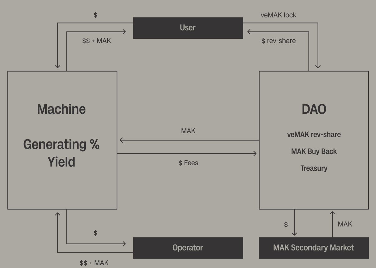 Makina's Operator approach enables professional asset managers to deploy their expertise fully onchain. Value created is distributed among all participants: liquidity providers receive the majority of returns for providing capital, Operators charge management and performance fees aligned with their strategy type, and the Makina DAO receives a share of those fees that accrue to MAK token holders. Strong performance attracts new capital and benefits all involved parties.